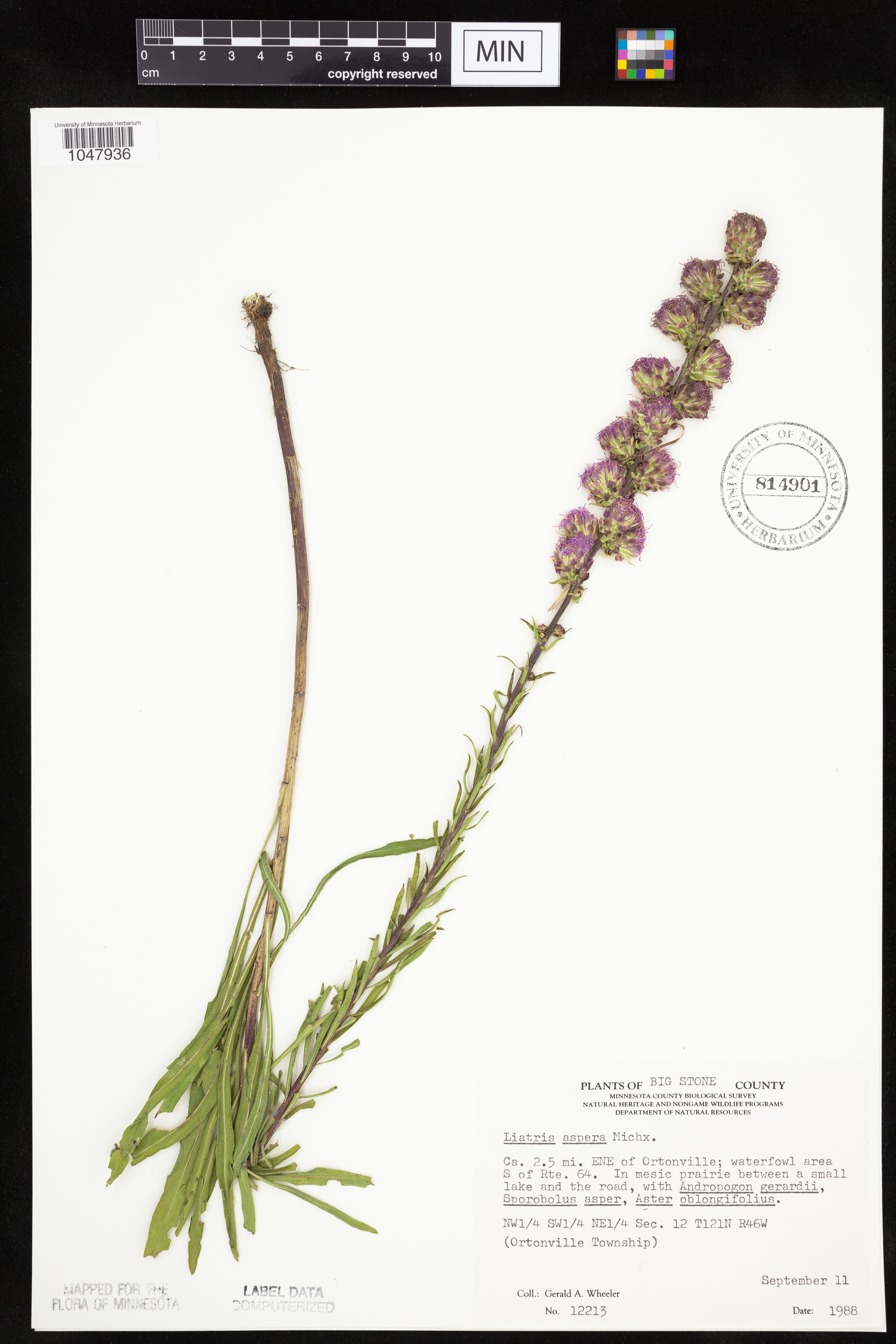 In mesic prairie, with Andropogon gerardii, Sporobolus asper, Aster oblongifolius