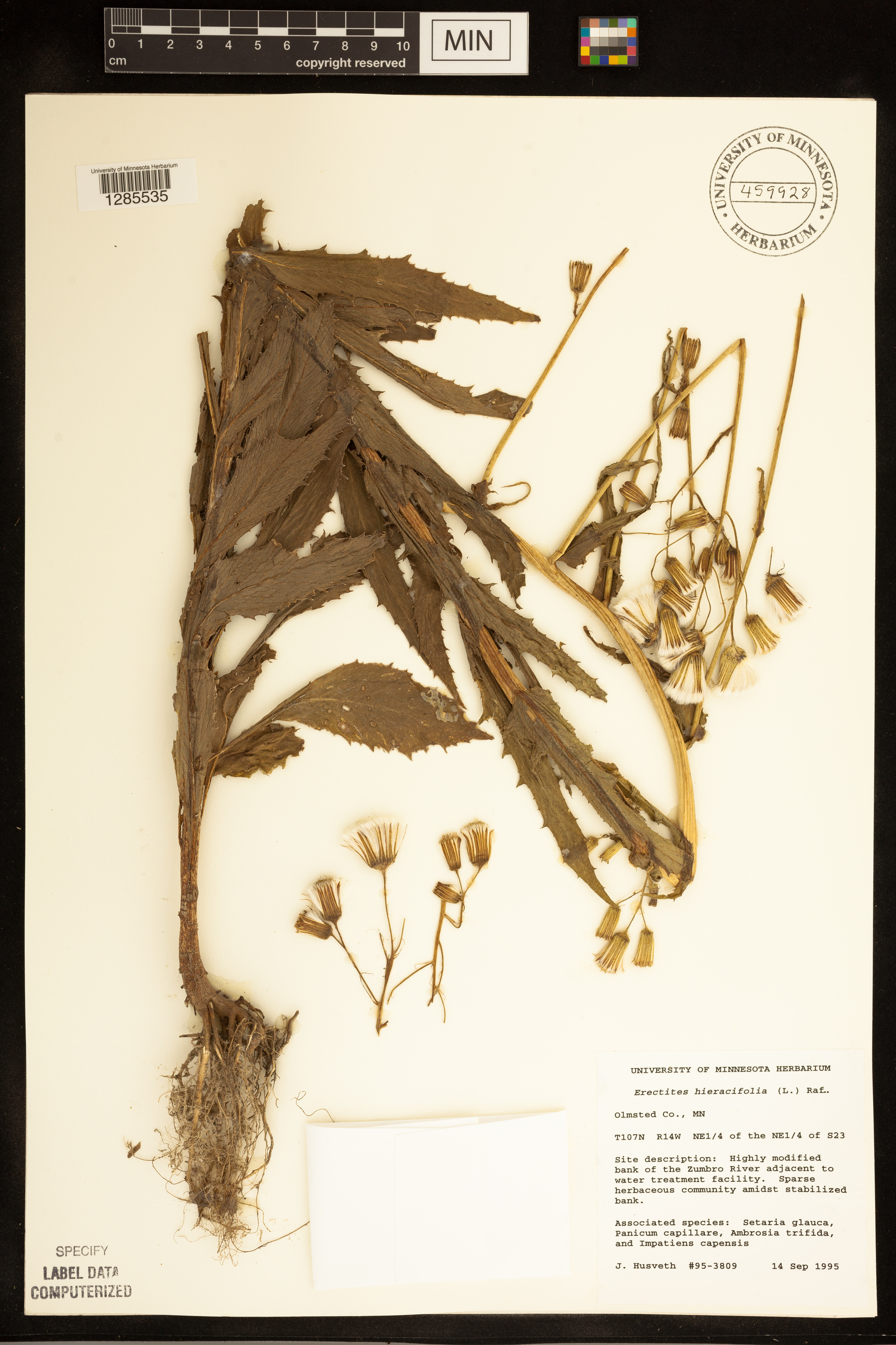 Highly modified bank of the [river]; Sparse herbaceous community amidst stabilized bank. Associated species: Setaria glauca, Panicum capillare, Ambrosia trifida, and Impatiens capensis