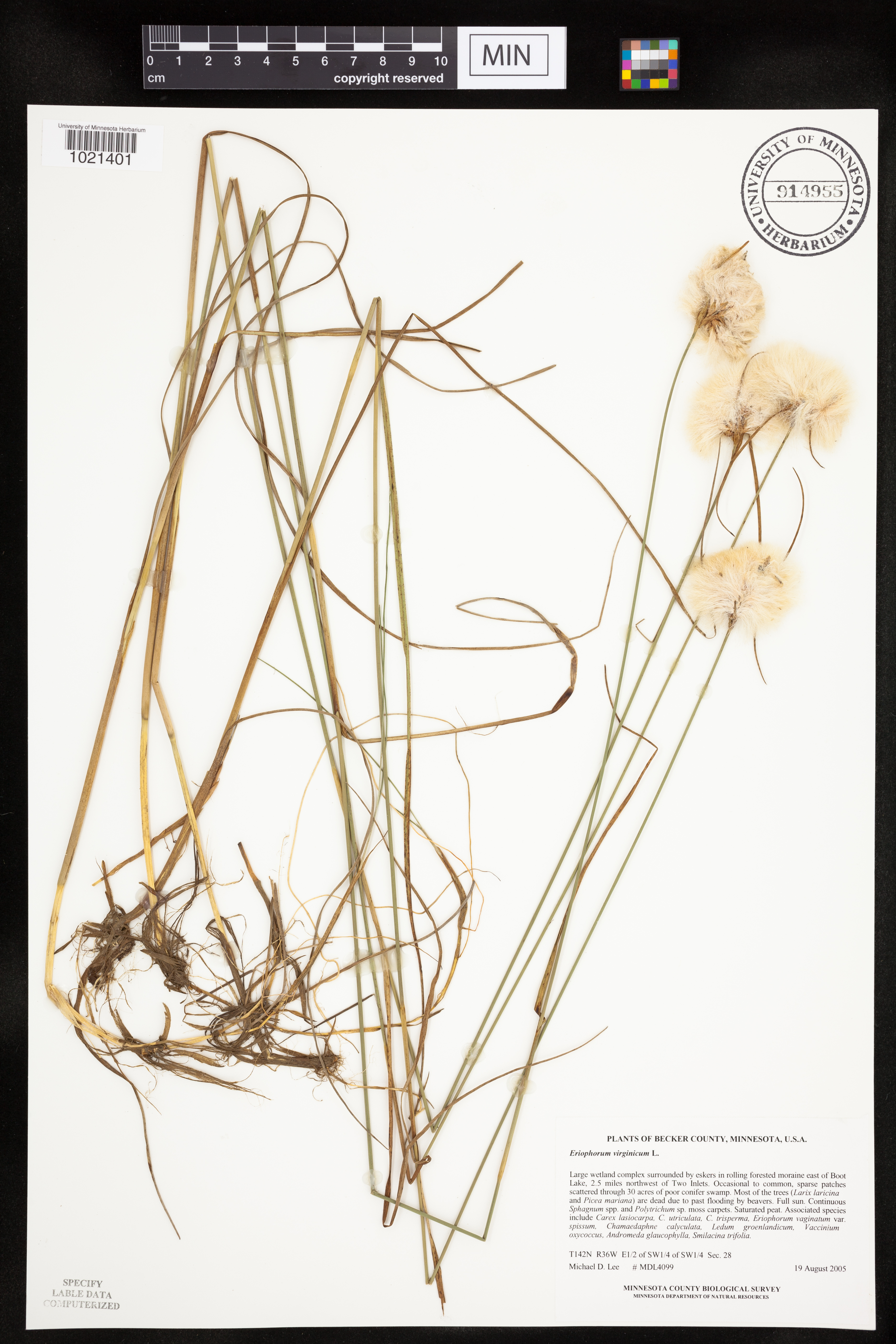 Large wetland complex surrounded by eskers in rolling forested moraine ... poor conifer swamp. Most of the trees (Larix laricina and Picea mariana) are dead due to past flooding by beavers. Full sun. Continuous Sphagnum spp. and Polytrichum sp. moss carpets. Saturated peat. Associated species include Carex lasiocarpa, C. utriculata, C. trisperma, Eriophorum vaginatum var. spissum, Chamaedaphne calyculata, Ledum groenlandicum, Vaccinium oxycoccus, Andromeda glaucophylla, Smilacina trifolia.