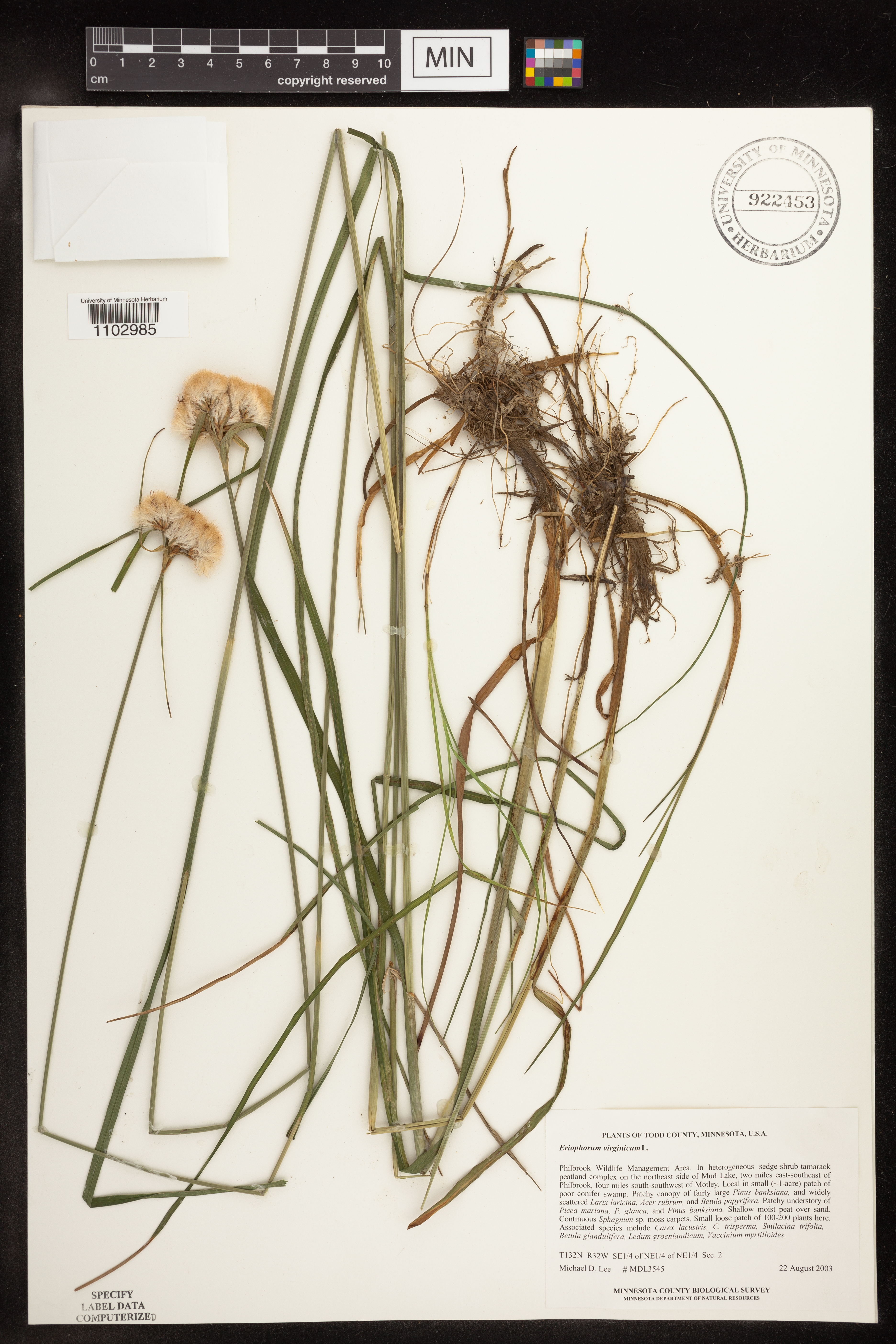 In heterogeneous sedge-shrub-tamarack peatland complex ... in small (~1-acre) patch of poor conifer swamp. Patchy canopy of fairly large Pinus banksiana, and widely scattered Larix laricina, Acer rubrum, and Betula papyrifera. Patchy understory of Picea m