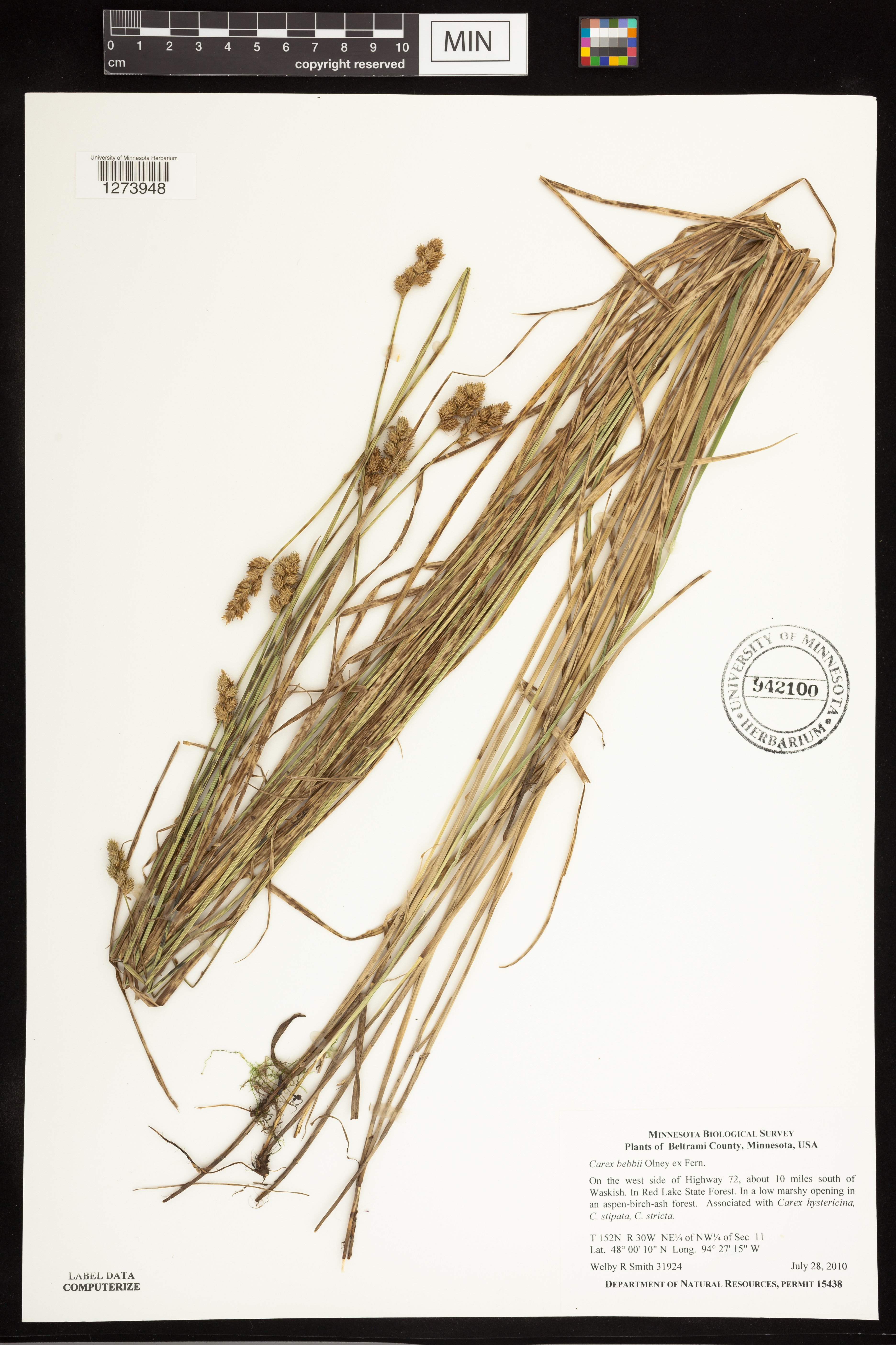 In a low marshy opening in an aspen-birch-ash forest. Associated with Carex hystericina, C. stipata, C. stricta.