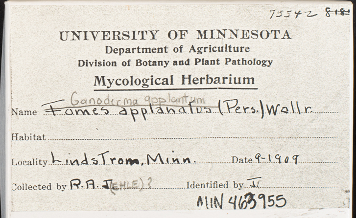 Originally determined as Fomes applanatus by R.A. Jehle (?) (Sep 1909).