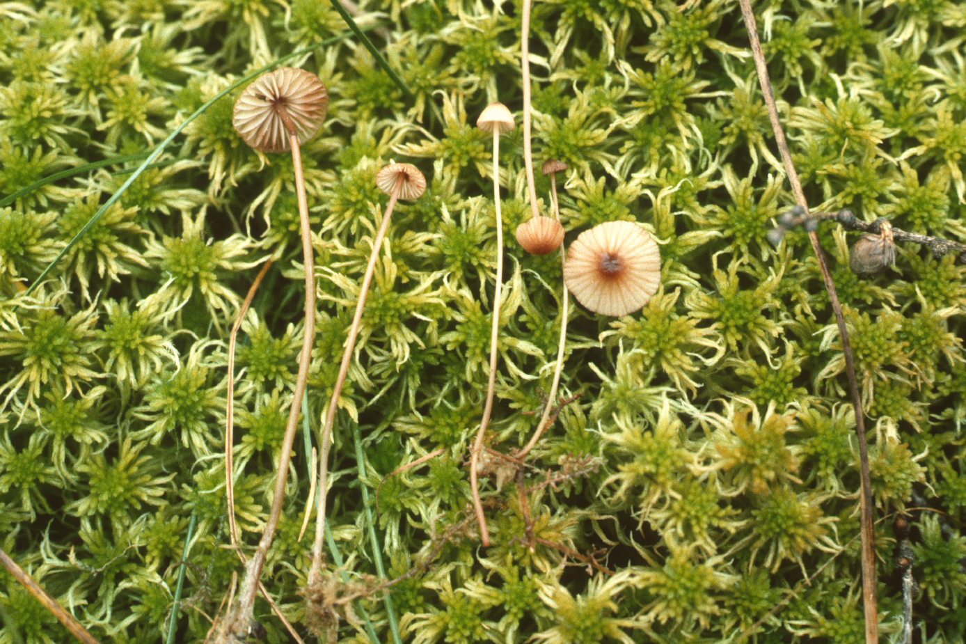 Apparently on ground in moss under larch and perhaps some decidous trees; attached to moss and leaves.