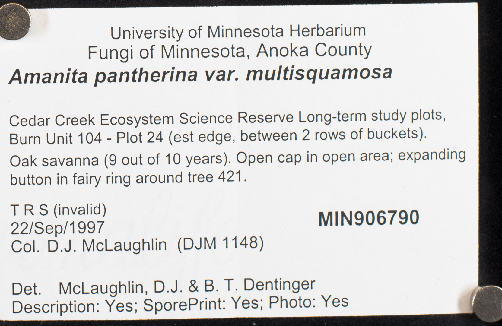 Oak savanna (9 out of 10 years). Open cap in open area; expanding button in fairy ring around tree 421.