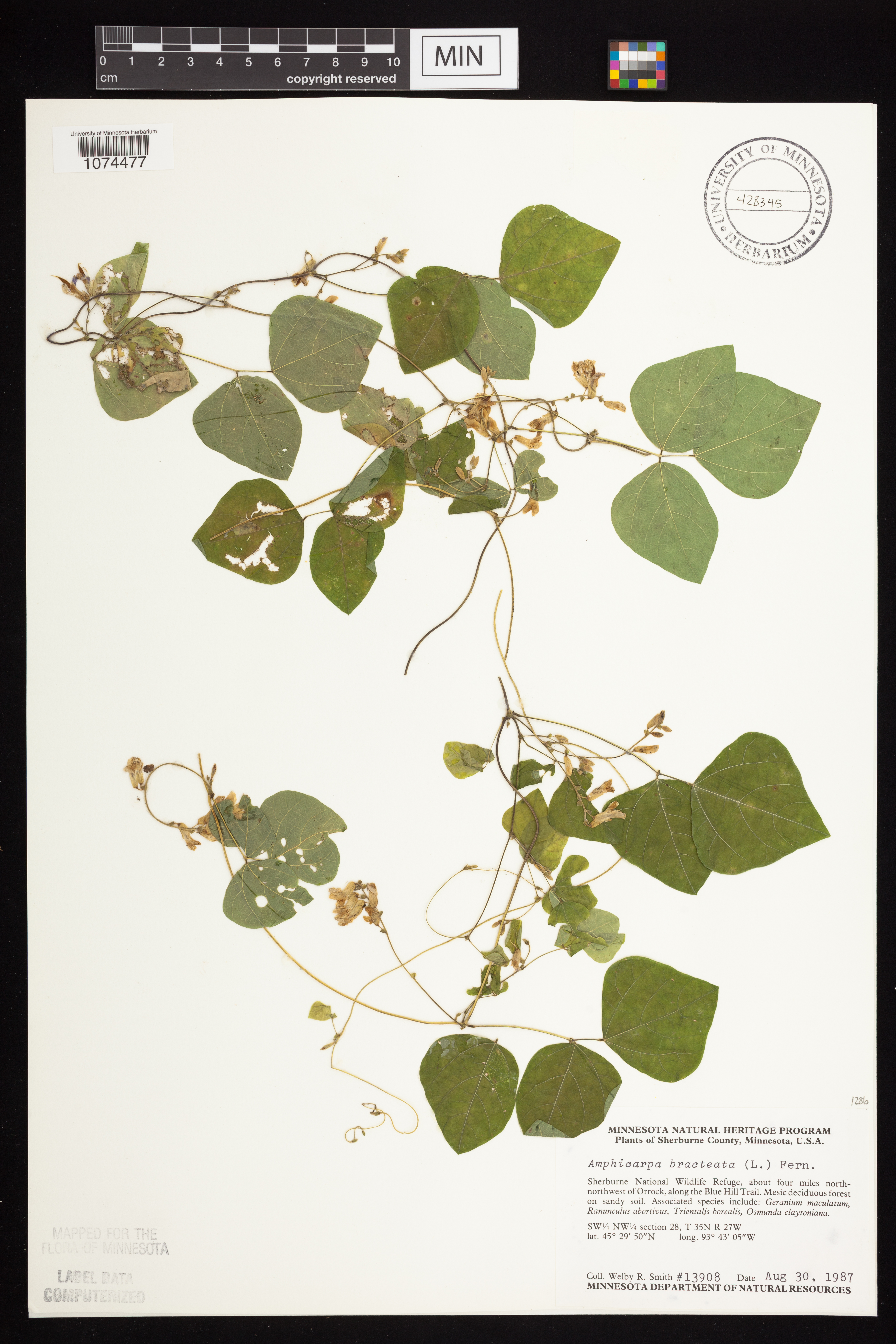 United States, Minnesota, Sherburne, Sherburne National Wildlife Refuge. Sherburne Co. Sherburne National Wildlife Refuge, about 4 mi N-NW of Orrock, along the Blue Hill Trail; SW1/4 NW1/4 sec.28, T35N R27W. 035N 27W 28