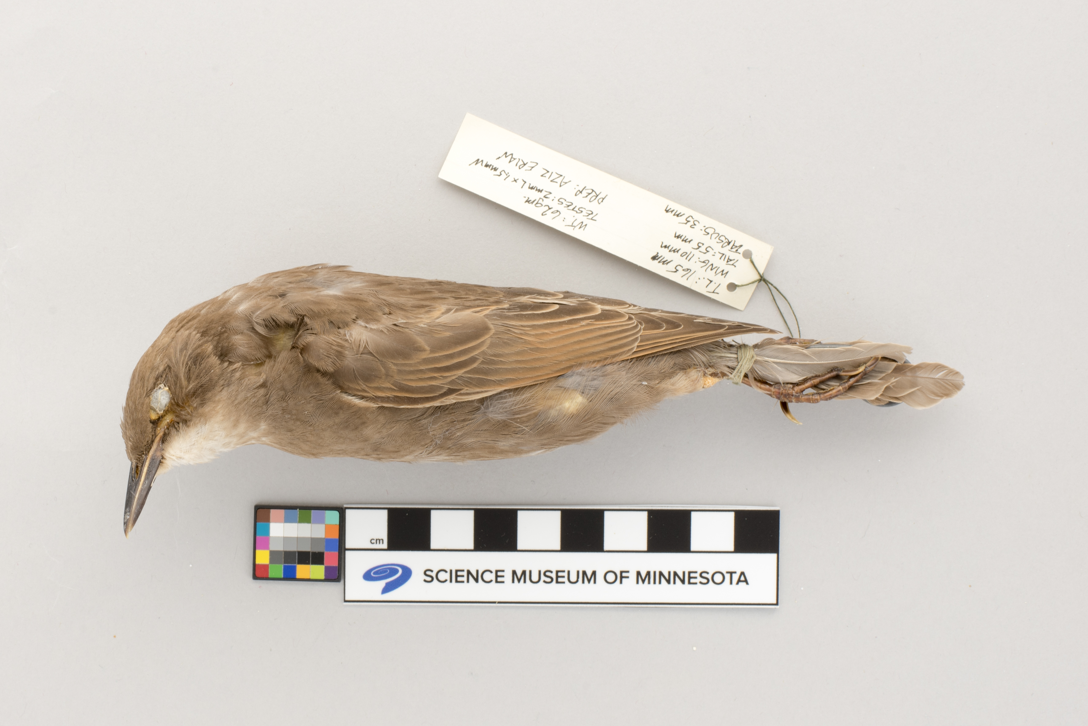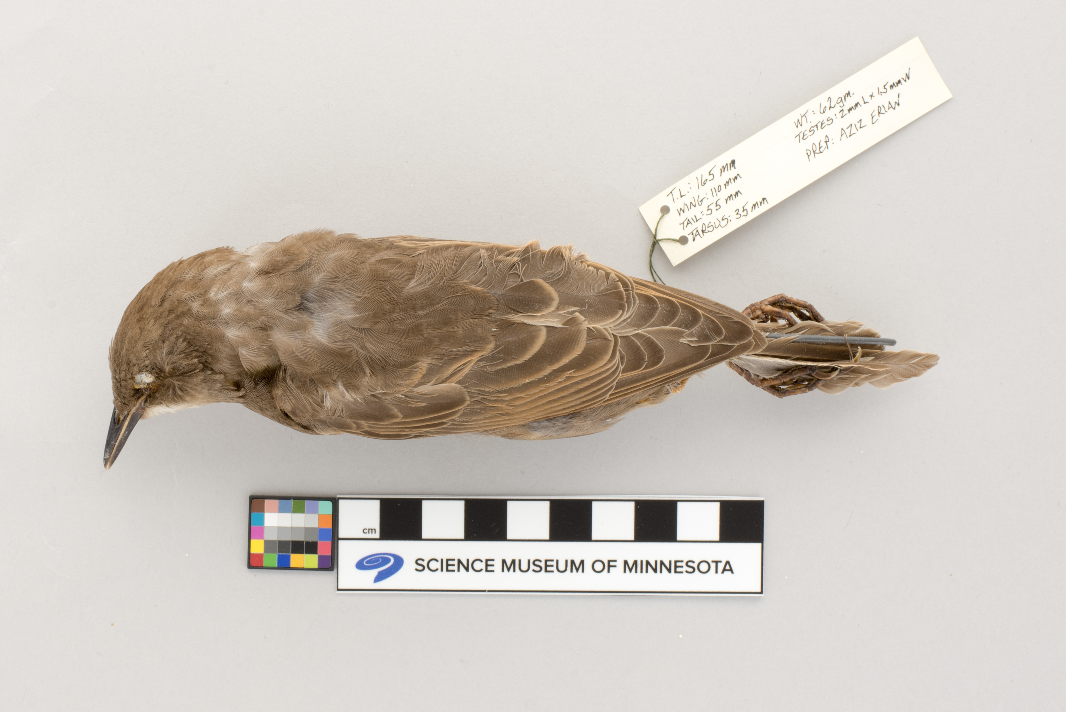 totalLengthInMillimeters:165, wingChordInMillimeters:110, tailLengthInMillimeters:55, tarsusLengthInMillimeters:35, weightInGrams:62, testisSizeInMillimeters:2 x 1.5, preparator:Aziz Erian,