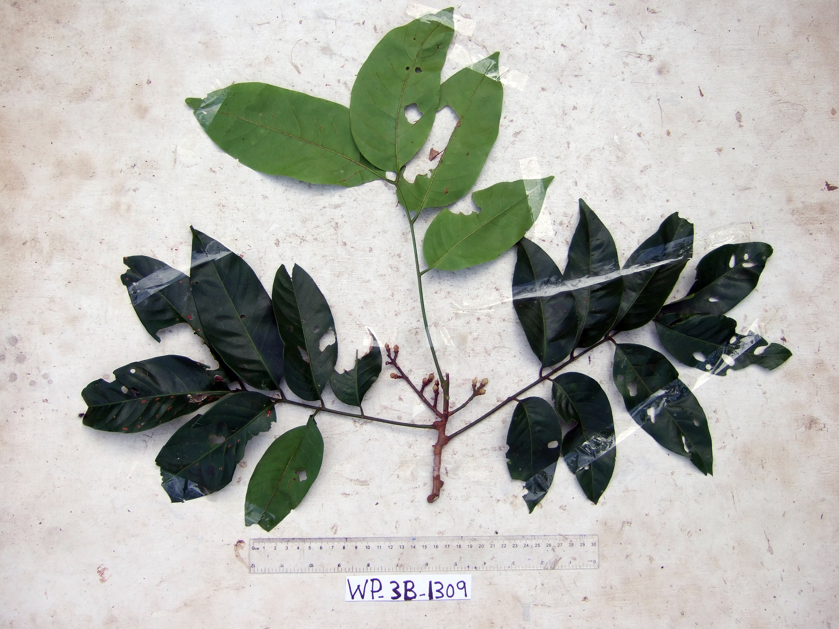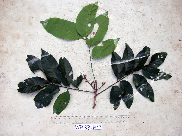tree, to 40.25 m in height, DBH 64 cm, trunk height to foliage 22.35 m, crown height 17.9 m, crown width 12.49 m, buttresses up to 2.38 m; foliage 62 kg mature wet mass, 0 kg juvenile wet mass; outer bark flaky, with lenticels; fissures vertical, broad, narrow; bark black, dark brown, brown, light brown, grey; cambium light brown, red; wood dark brown, brown, light brown; exudate absent; DNA preserved in silica, wood sample preserved, from felled plot. Local name: maksan Local use: timber for house construction, used for fencing