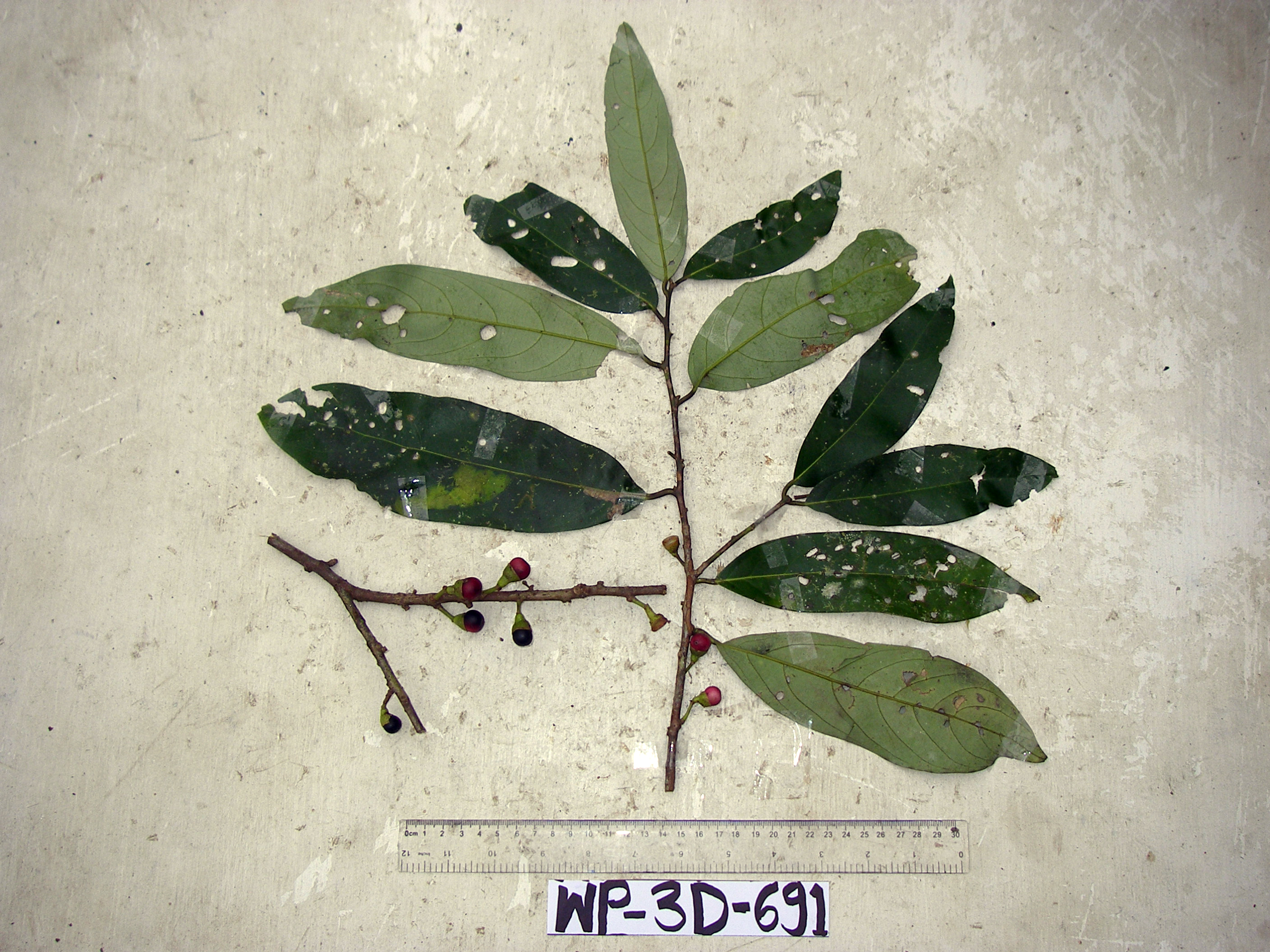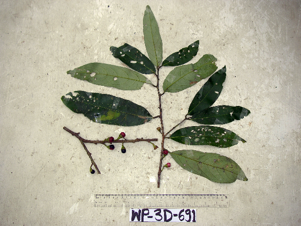 tree, to 9.62 m in height, DBH 6.9 cm, trunk height to foliage 6.47 m, crown height 3.15 m, crown width 3.05 m; foliage 2.7 kg mature wet mass, 0 kg juvenile wet mass; outer bark smooth; bark brown, white, grey, green; cambium brown; wood brown, white; exudate absent; DNA preserved in silica, from felled plot. Local name: malang malang Local use: used for fencing, young leaves are chewed with betel nuts, timber for house construction, used for constructing small huts, used for firewood
