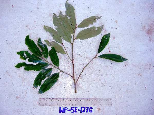 tree, to 9.5 m in height, DBH 7 cm, trunk height to foliage 4.75 m, crown height 4.75 m, crown width 4.75 m; foliage 0 kg mature wet mass, 0 kg juvenile wet mass; outer bark smooth, rough, with lenticels; fissures horizontal, broad; bark black, dark brown, grey; cambium dark brown, brown, green; wood orange, yellow; exudate absent; DNA preserved in silica, from felled plot. Local name: malang malang Local use: used for fencing, young leaves are chewed with betel nuts, timber for house construction, used for constructing small huts, used for firewood