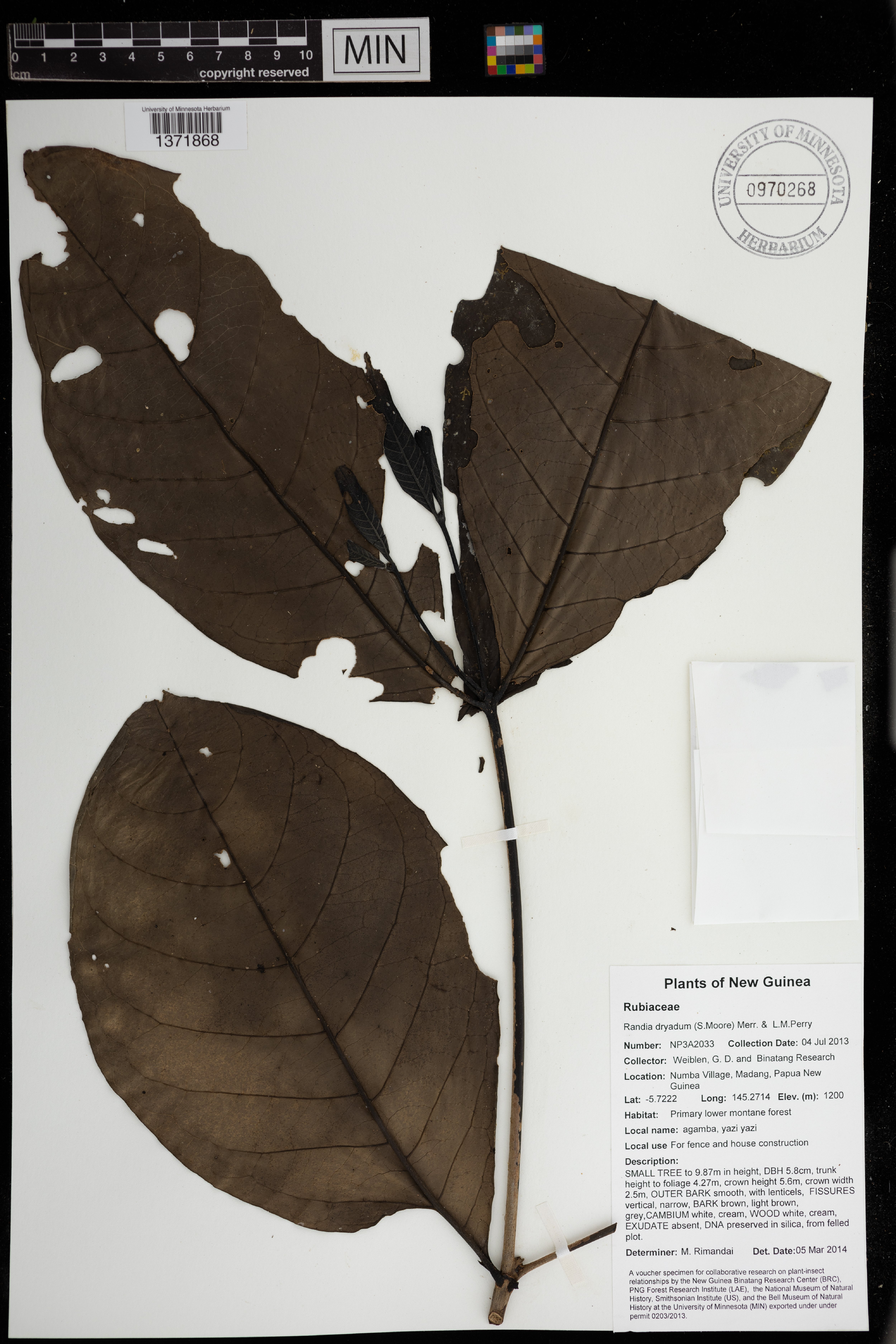 small tree, to 9.87 m in height, DBH 5.8 cm, trunk height to foliage 4.27 m, crown height 5.6 m, crown width 2.5 m,; foliage 0.356 kg mature wet mass, ; outer bark smooth, with lenticels,; fissures vertical, narrow,; bark brown, light brown, grey,; cambium white, cream,; wood white, cream,; exudate absent,; from felled plot. Local Name(s): agamba, yazi yazi ; Local Use(s): For fence and house construction.
