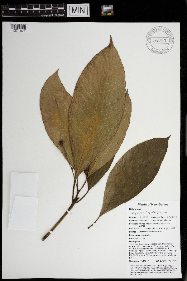 tree, to 6.35 m in height, DBH 9.6 cm, trunk height to foliage 2.6 m, crown height 3.75 m, crown width 4.01 m,; foliage 6 kg mature wet mass, ; outer bark with lenticels,; fissures vertical, horizontal, narrow,; bark black, dark brown, brown, light brown,; cambium white,; wood light brown, white,; exudate absent,; DNA preserved in silica, from felled plot. Local Name(s): wakawaka; Local Use(s): no use.