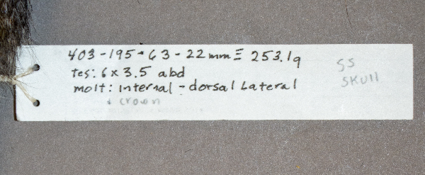 totalLengthInMillimeters:403 | tailLengthInMillimeters:195 | hindFootLengthInMillimeters:63 | earLengthInMillimeters:22 | weightInGrams:253.1 | testisDiameterInMillimeters:6 x 3.5 | molt:internal-dorsal lateral, and crown | preparator:R.J.O.
