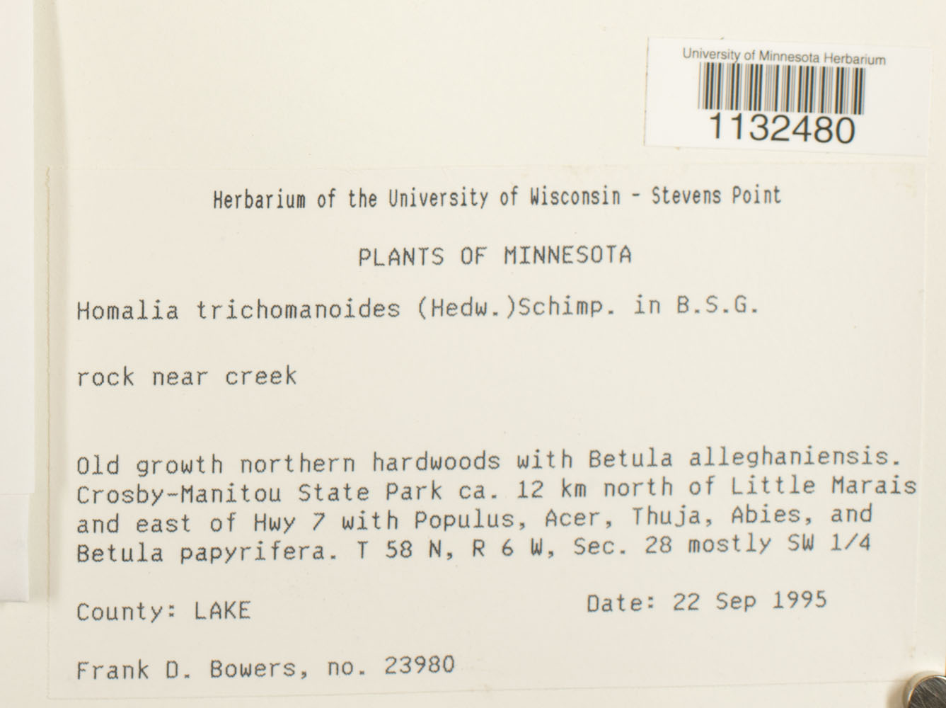 United States, Minnesota, Lake, Crosby-Manitou State Park ca. 12 km north of Little Marais and east of Hwy 7; T 58 N, R 6 W, Sec. 28 mostly SW 1/4