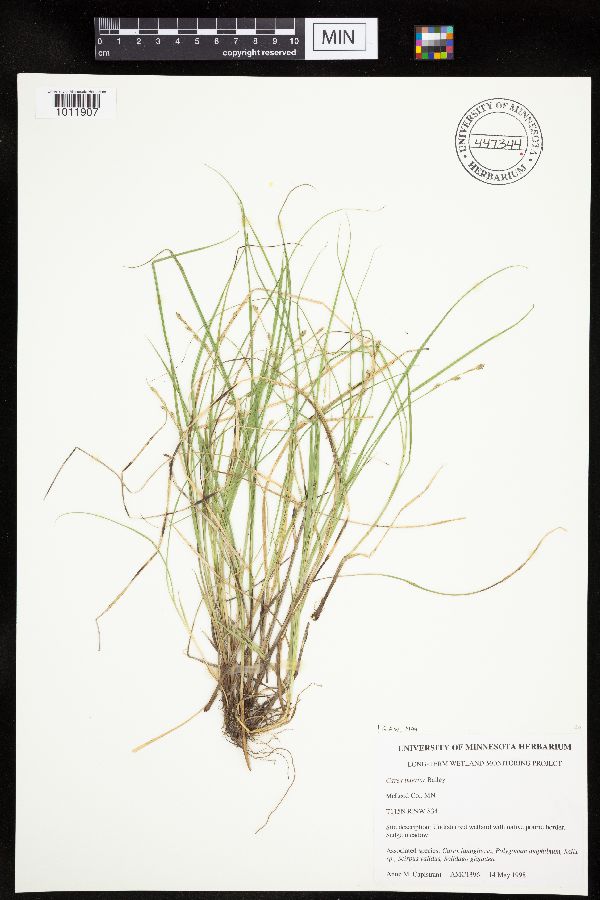 Undisturbed wetland with native prairie border. Sedge meadow. Associated species: Carex lanuginosa, Polygonum amphibium, Salix sp., Scirpus validus, Solidago gigantea