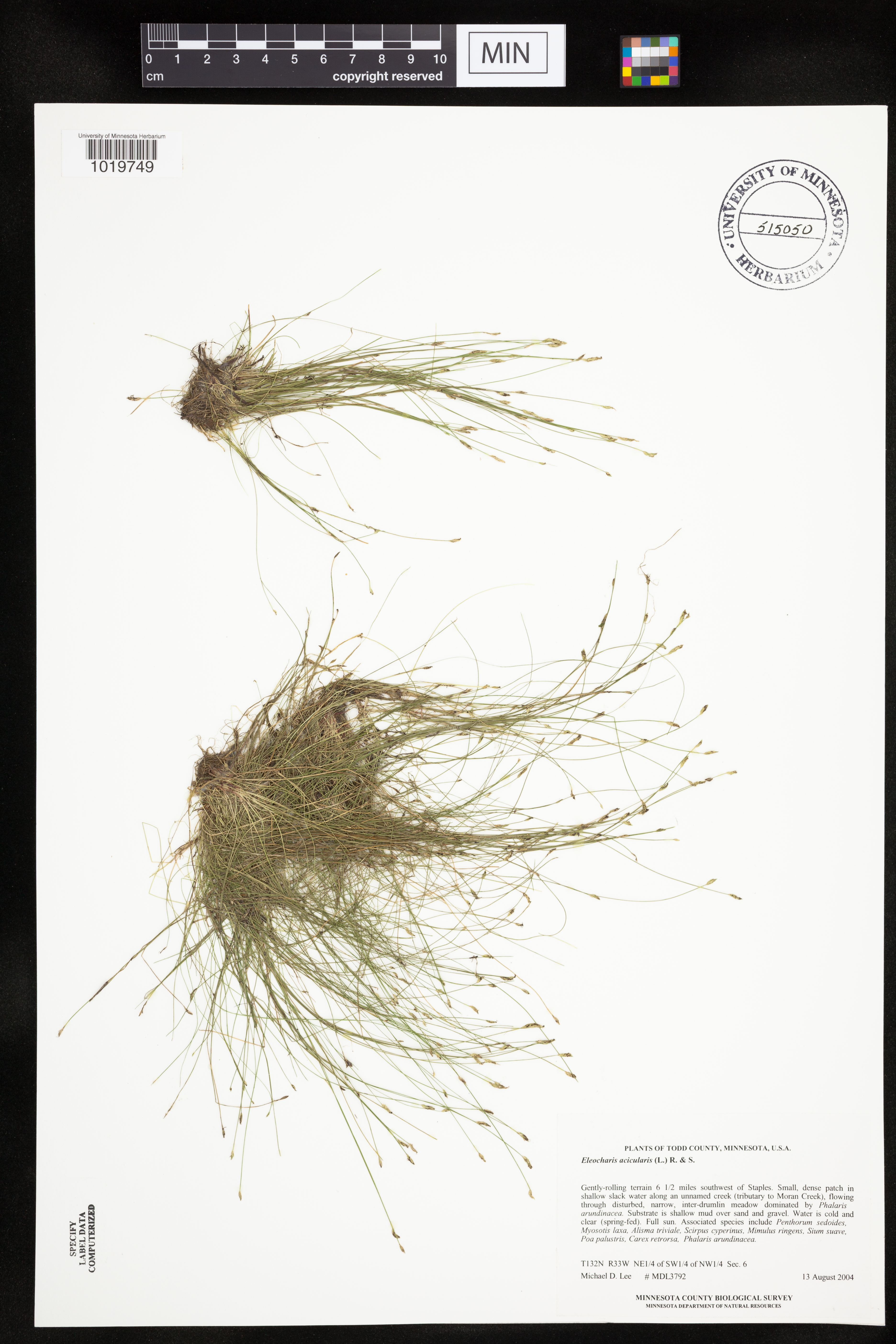 Gently-rolling terrain ... In shallow slack water along an unnamed creek ... flowing through disturbed, narrow, inter-drumlin meadow dominated by Phalis arundinacea. Substrate is shallow mud over sand and gravel. Water is cold and clear (spring-fed). Full sun. Associated species include Penthorum sedoides, Myosotis laxa, Alisma triviale, Scirpus cyperinus, Mimulus ringens, Sium suave, Poa palustis, Carex retrorsa, Phalaris arundinacea.