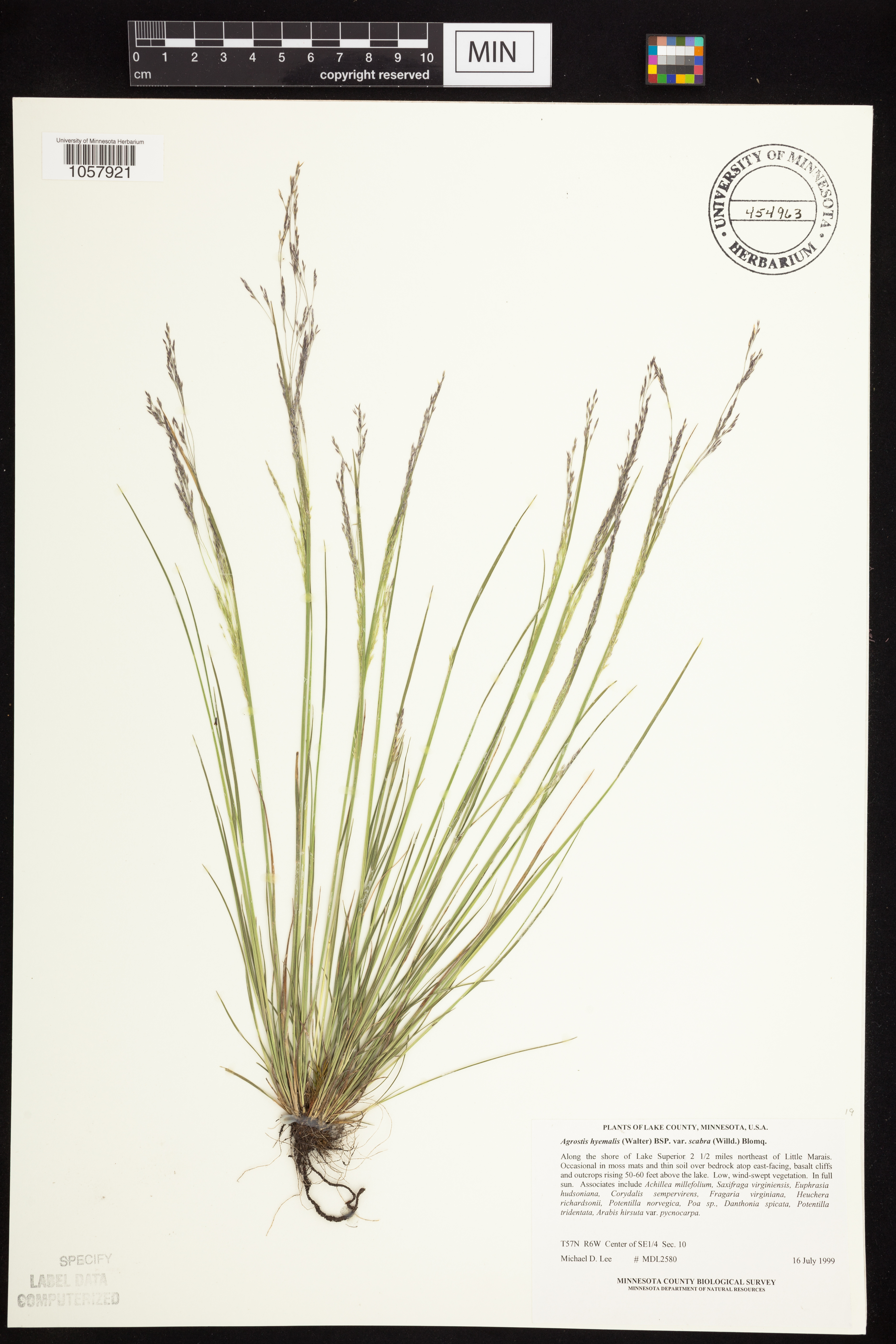 in moss mats and thin soil over bedrock atop east-facing, vasalt cliffs and outcrops rising 50-60 feet above the lake. Low, wind-swept vegetation. In full sun. Associates include Achillea millefolium, Saxifraga virginiensis, Euphrasia hudsoniana, Corydalis sempervirens, Fragaria virginiana, Heuchera richardsonii, Potentilla norvegica, Poa sp., Danthonia spicata, Potentilla tridentata, Arabis hirsuta var. pycnocarpa.